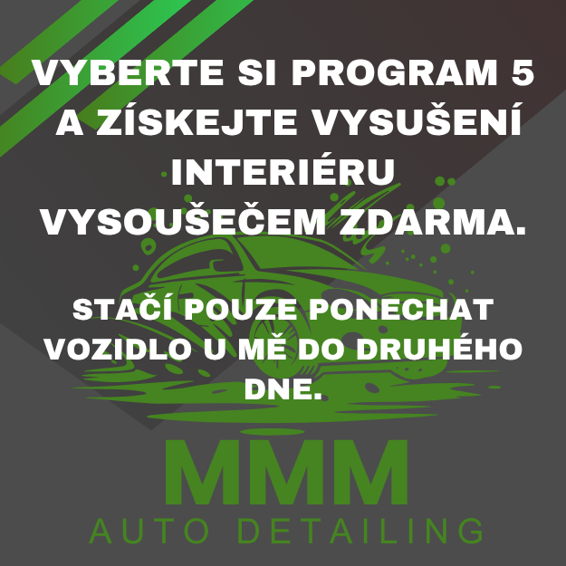 - Komplexní mytí auta (včetně oplachování, mytí motoru a kol, vysávání interiéru)